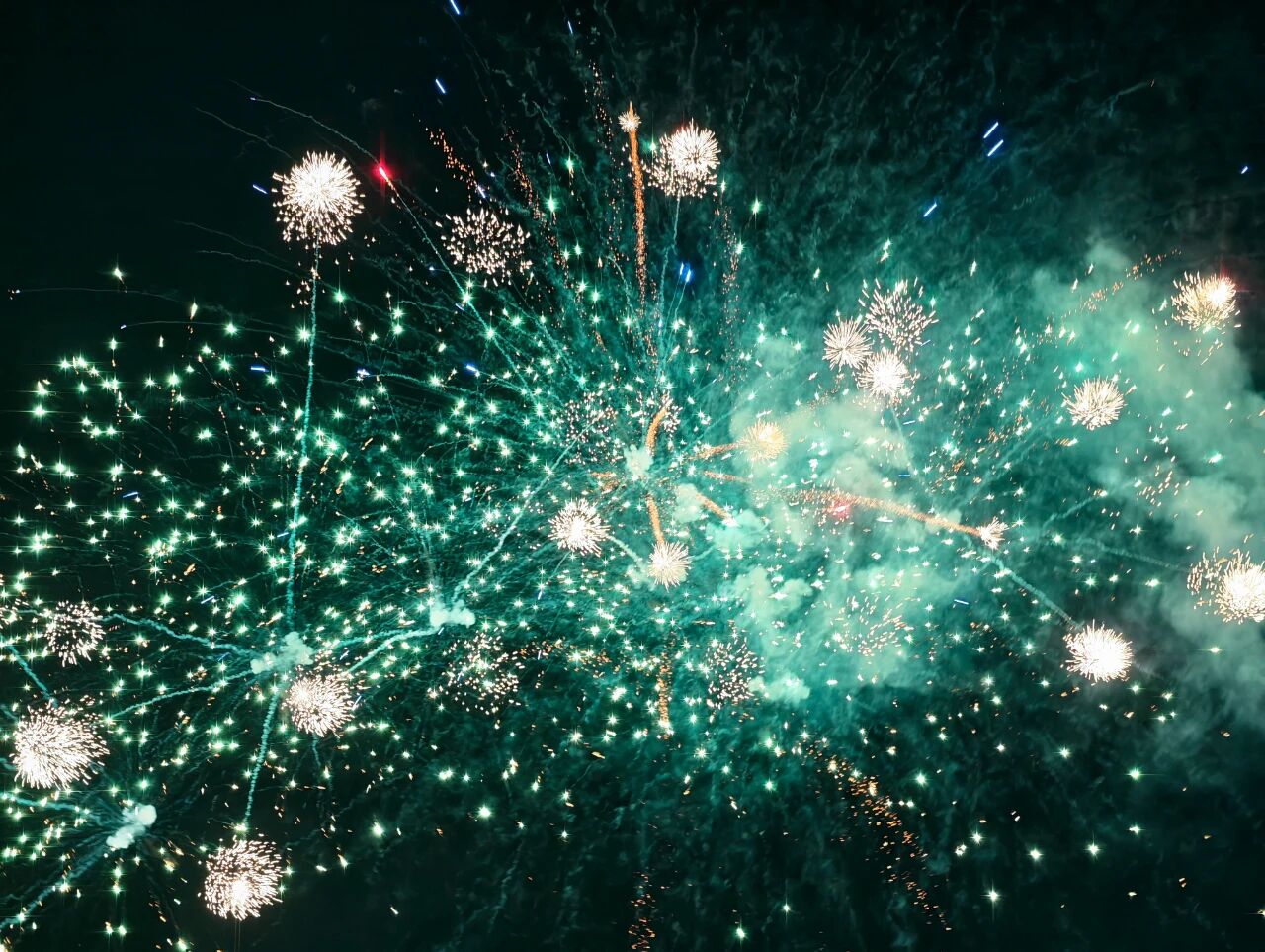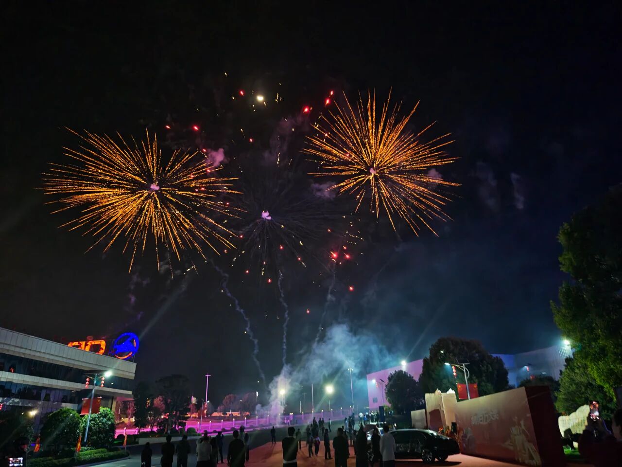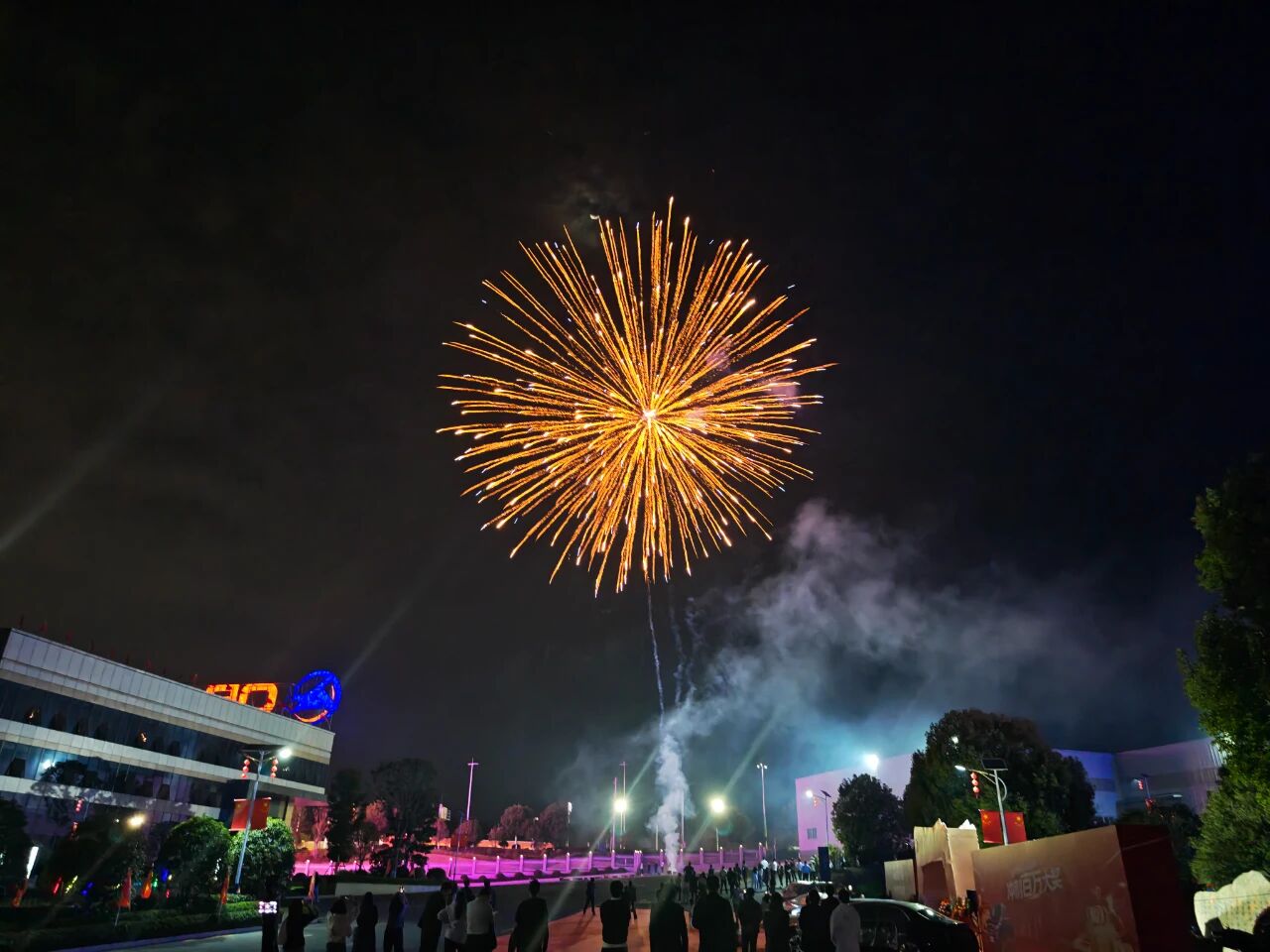 话音刚落,第一朵烟花呼啸着冲上夜空,“砰”地一声炸开,金色的流光如稻穗般洒落,照亮了整个园区。紧接着,无数烟花争先恐后地升空,红的、紫的、蓝的、绿的,交织成一片流光溢彩的海洋。有的如垂柳丝丝,有的似菊花绽放,有的像流星雨划过天际,每一朵都在诉说着“欢迎回家”的深情。