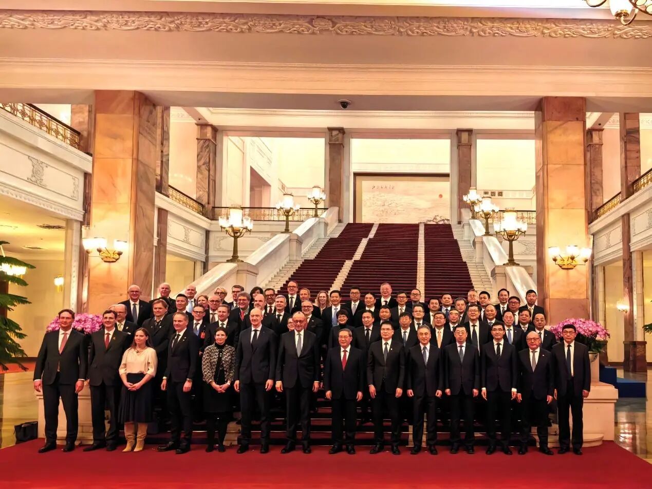 25日下午,中德经济顾问委员会在人民大会堂组织举办了中德经贸企业代表座谈会。来自工商银行、中信集团、三峡集团、潍柴集团、华为技术、宁德时代、小米、京东、国轩高科、正泰集团等中方企业代表参加了此次座谈。中国国务院总理李强和德国总理默茨出席座谈会,并与两国企业家代表互动交流。