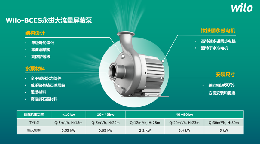 Wilo-BCES系列大流量永磁屏蔽泵产品,是专门面向严苛使用环境、高防护要求、高可靠性要求的储能温控配套定制水泵市场,针对非常有限的安装空间、设备泄漏风险、设备运行噪音高以及设备位置偏远为维修带来极大不便利性等行业痛点,Wilo-BCES系列产品极其紧凑的产品结构、零泄漏的运行保障、水冷电机的有效降低噪音以及IP68的超高防护等级,都将为储能温控行业设备商及终端用户带来更加安心的使用体验、更好的运行保障,以及更多的成本节约和对周边环境及人文安全的维护。