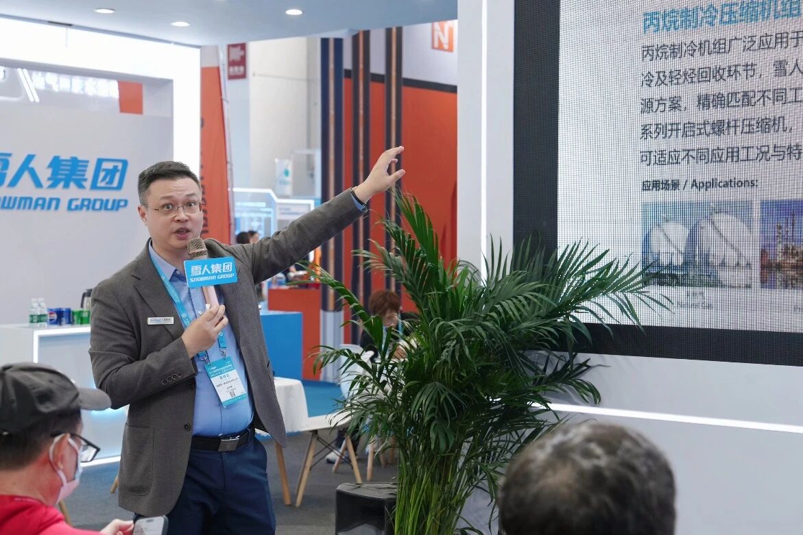 在展品方面,雪人展出了丙烷制冷机组,该机组采用天然工质丙烷作为制冷剂,制冷量达3300 千瓦,压缩机采用SRM开启式双螺杆结构,符合API619与API614标准,广泛应用于天然气处理、LNG液化、化工储运及工业制冷等领域。