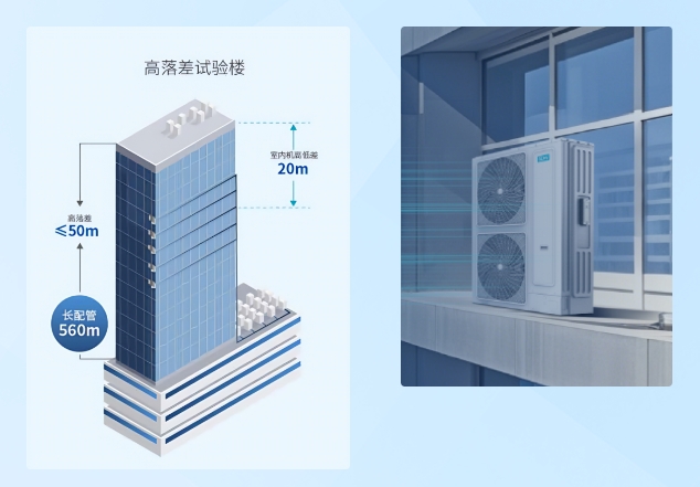 具备560m超长的冷媒配管长度和50m高落差设计,有效增加了设备布局的灵活性,能够根据建筑的实际结构和空间特点,进行更为灵活、合理的布局。