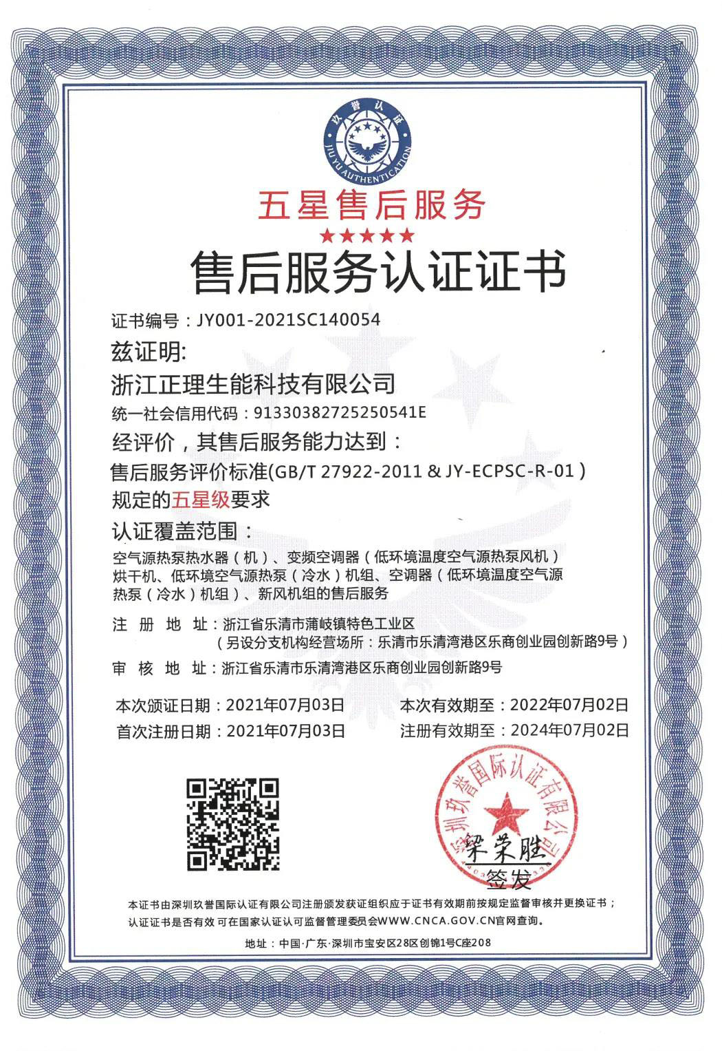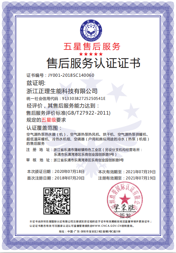 据悉,生能已连续四年获评五星售后服务认证。2018年,生能首次荣获五星售后服务认证证书,2020年,生能复审达到售后服务评价标准,再获五星售后服务认证证书。