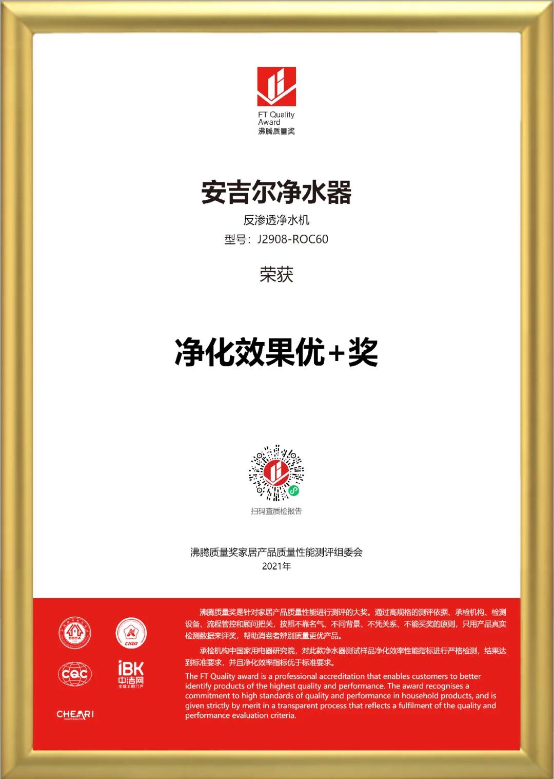 近日,有着家居行业质量“奥斯卡”之称的2021年度沸腾质量奖重磅公布,凭借着畅销实力和专业品质,安吉尔A7 lite大水量净水器斩获2021年沸腾质量奖净化效果优+奖。