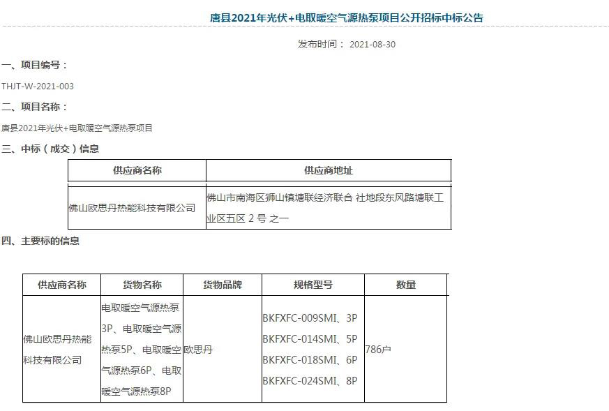 近日,中国河北政府采购网公示唐县2021年光伏+电取暖空气源热泵项目公开招标项目公告招标结果,佛山欧思丹热能科技有限公司等实力企业,成功中标!