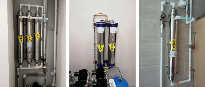 立升专利技术——PVC合金毛细管式超滤膜技术,过滤精度0.01微米,截留分子量超过50000道尔顿,原水经增压后进入超滤膜组件内的毛细管式超滤膜内腔,通过超滤膜的过滤作用,原水中的细菌、藻类、悬浮物、胶体和其大分子有机物等被超滤膜截留,净水从膜壁四周渗出并汇集成为超滤产水,出水水质达国家《生活饮用水卫生标准》(GB5749-2006)。