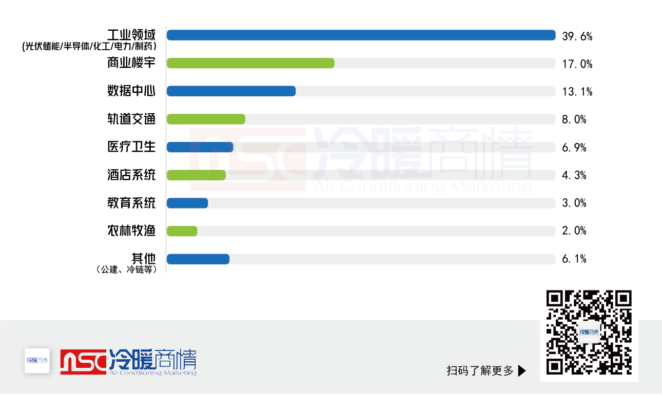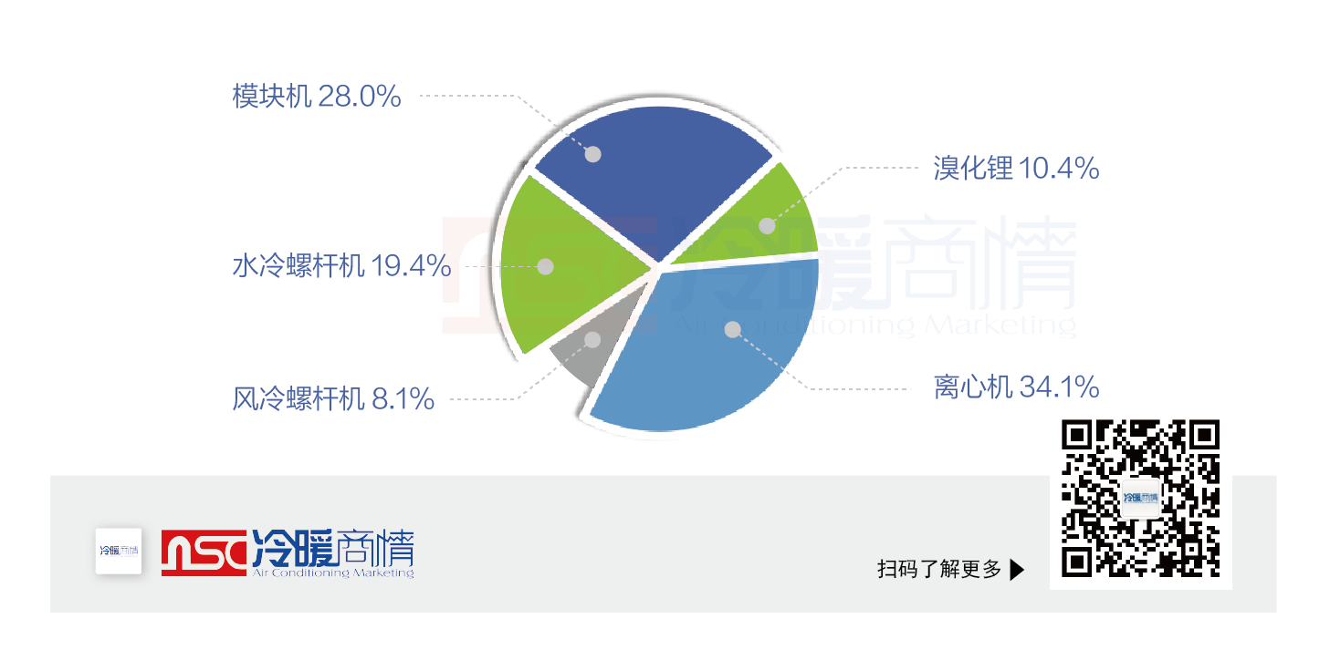 从产品品类来看,离心机以34.1%的占有率位居首位,这与其在大冷量、高能效应用场景中的技术优势密不可分,特别是在大型工业项目、数据中心等领域;模块机(28.0%)凭借其灵活配置、安装简便的特点,在商业建筑和区域能源项目中保持稳定需求。水冷螺杆机(19.4%)则在应用中占据重要位置;溴化锂机组仍保有10.4%的市场份额,主要在工业余热利用、热电联产等特定场景中发挥作用。