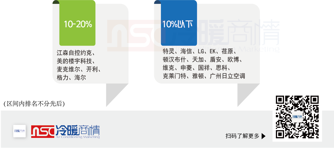 特灵、海信、LG、EK、荏原、顿汉布什、天加、盾安、欧博、维克、申菱、国祥、思科、克莱门特、雅顿、广州日立空调市场占有率在10%以下。这一区间竞争尤为激烈,品牌之间在细分市场、区域布局和应用领域展开差异化竞争。